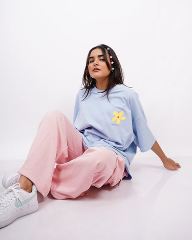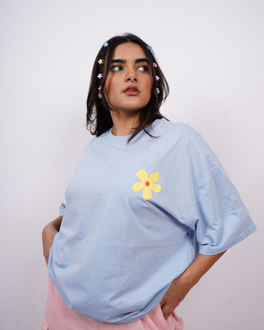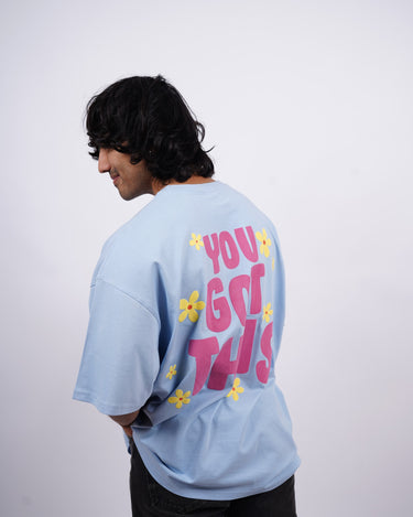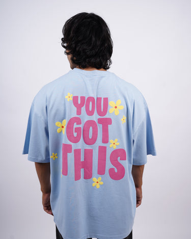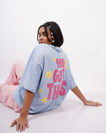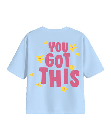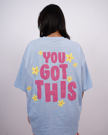 Stay motivated and spread positivity with this light blue oversized T-shirt featuring a bold "YOU GOT THIS" graphic on the back. Designed with playful pink lettering and cheerful yellow flowers, this tee exudes a fun and uplifting vibe.