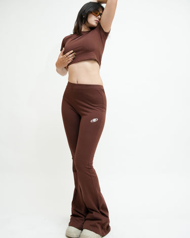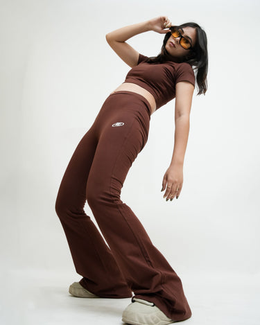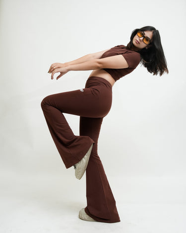 Unleash your inner trendsetter with the Hailey Set, a perfect blend of comfort and style. This co-ord set features a fitted cropped T-shirt and high-waisted flared pants, giving you a sleek and elongated silhouette. The rich brown hue adds a touch of warmth and sophistication, making it a must-have for any fashion-forward wardrobe.