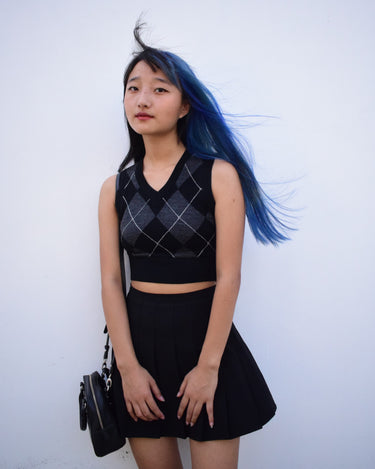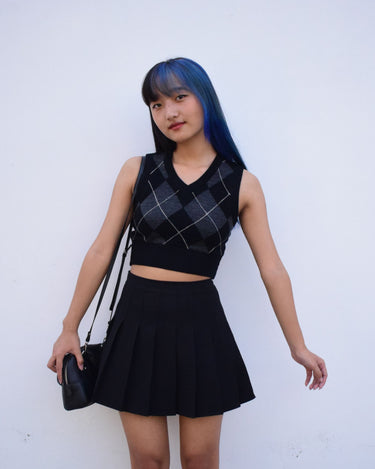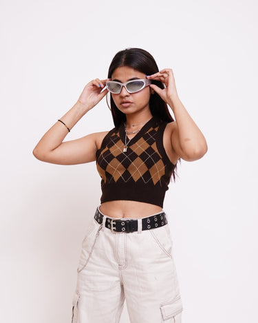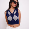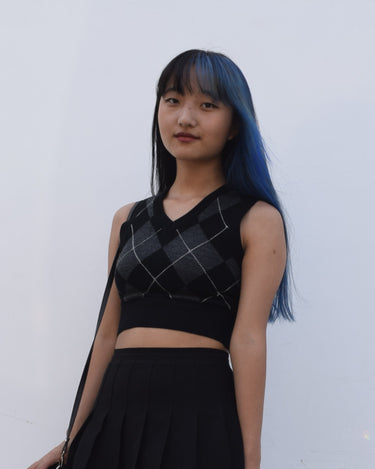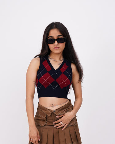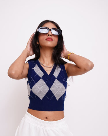 Upgrade your wardrobe with this stylish Women’s Body Fit V-Neck Sleeveless Vest, also known as the Tennis Vest. Featuring a classic argyle pattern, this cropped knit vest blends vintage charm with modern street style. The snug, body-hugging fit enhances your silhouette, while the deep V-neckline adds a flattering touch.