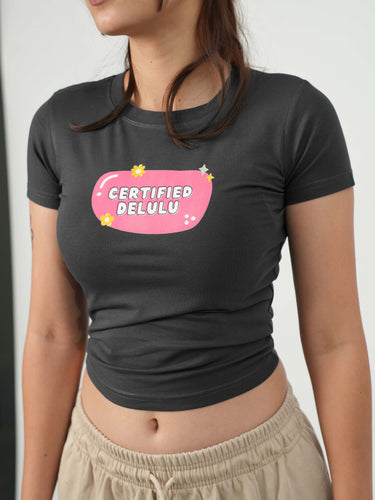 Living in your own world? Good. The Certified Delulu Baby Tee is here to validate your fantasy era. Whether you're convinced he’s obsessed with you after one story view or manifesting a whole career from your notes app — this tee is your official badge of honor.