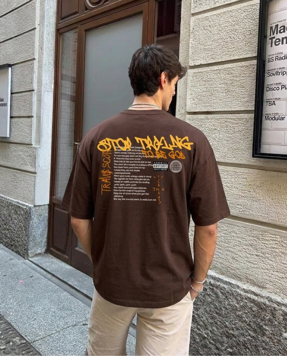 Make a bold statement with this brown oversized T-shirt featuring striking angelic artwork. The back showcases a majestic golden-winged figure with a halo, exuding a celestial yet streetwear-inspired vibe. The front features graffiti-style typography reading "Stop Talking to the God", along with additional text elements that add depth to the design.