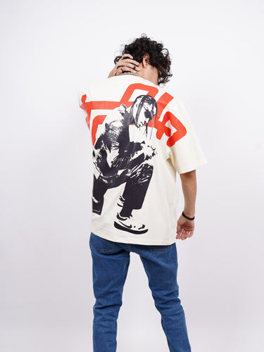 This bold oversized T-shirt is a must-have for street wear lovers, featuring a striking Utopia-themed design. The back showcases a high-contrast black-and-white image of a figure, overlaid with bold red stylized text, creating an urban and futuristic aesthetic.