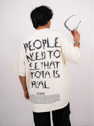 Make a bold statement with the Utopia Oversized Graphic Tee. Featuring an eye-catching back print that spells out "PEOPLE NEED TO SEE THAT UTOPIA IS REAL" using creative human-figure typography, this tee is a perfect blend of fashion and expression.