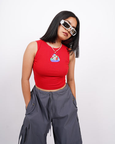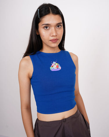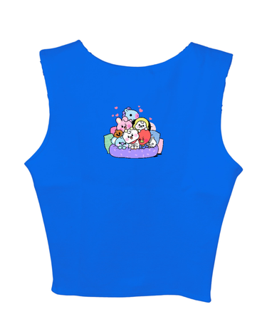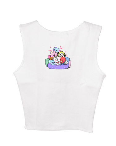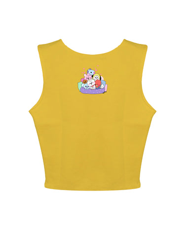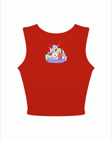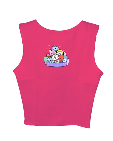 The BT21 Friends: Burger Bae Sleeveless Rachel Tank for Women brings a playful pop of color to your wardrobe. Featuring a fun, multi-character BT21 graphic on a vibrant ribbed fabric, this cropped tank seamlessly blends cute and cool. Its snug, sleeveless design flatters your silhouette while keeping you comfortable for everyday wear.