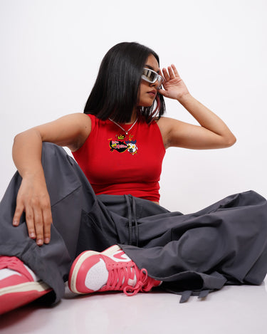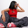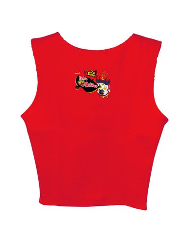 The Buldak 2x Spicy: Burger Bae Sleeveless Rachel Tank for Women serves up fiery style in a vibrant red hue, inspired by the heat of everyone’s favorite spicy noodles. Crafted from a soft, ribbed fabric, this cropped tank hugs your figure for a sleek, confident look.