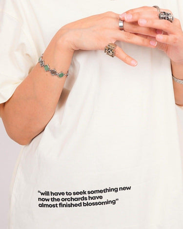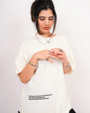 On the back of the tee, you'll find a beautiful almond blossom graphic that adds a pop of color and nature-inspired charm. On the front, there's a stunning quotation that will inspire you throughout your day.