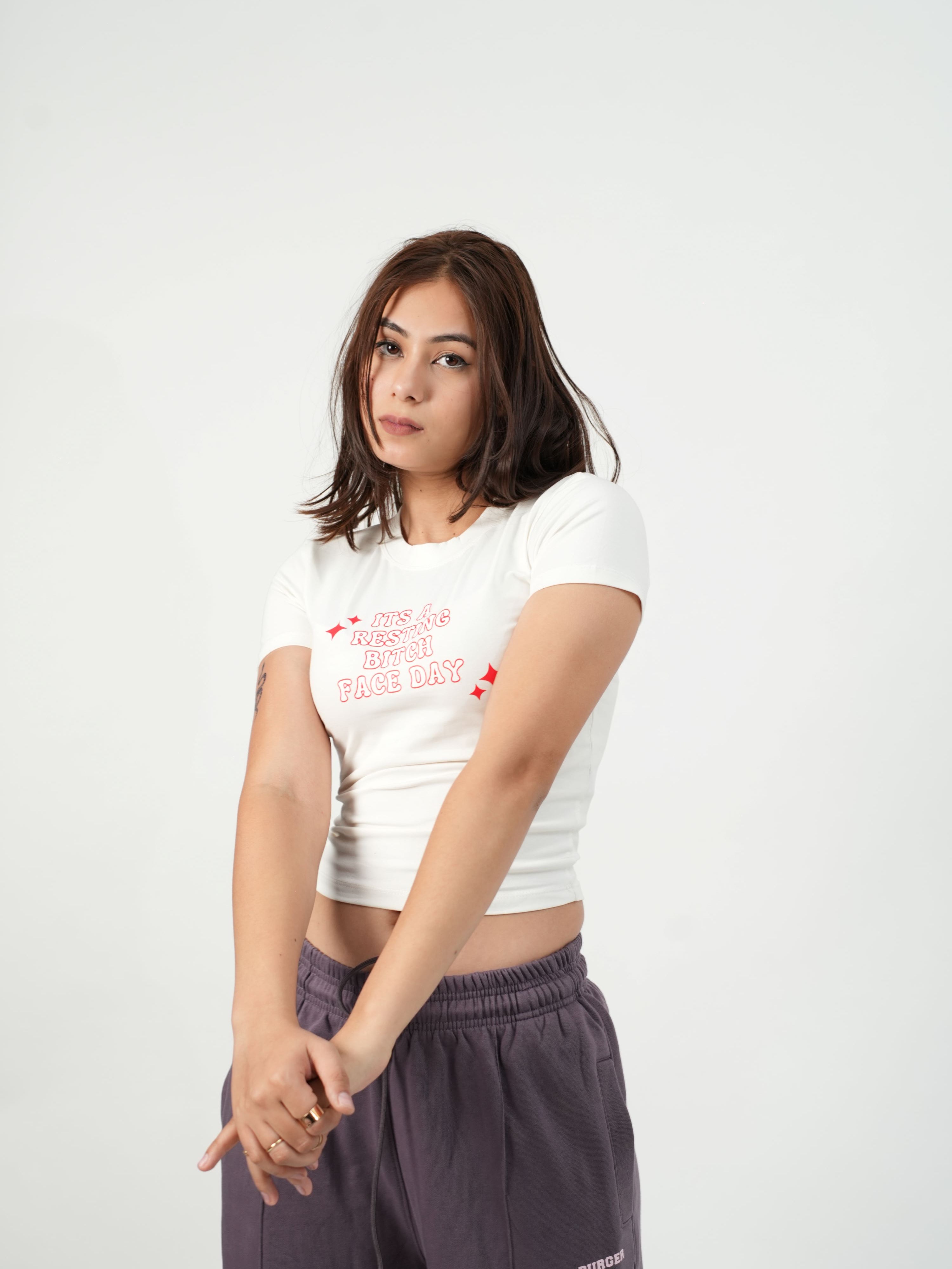 Smiling? Not today. The “Resting B*tch Face” Baby Tee is for the girls who aren’t here to fake it. Serving savage softness with a wink of sass, this crisp crop comes with bold red bubble text that lets the world know: your face isn’t mad — it’s just expensive.