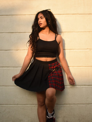 Make a statement with the Jisoo Skirt, a perfect fusion of punk and preppy aesthetics. Featuring a unique asymmetrical design, this skirt combines classic red plaid with a sleek black panel for a striking contrast. The decorative metal buckle detail adds an extra edge, making it a must-have for anyone who loves to stand out.