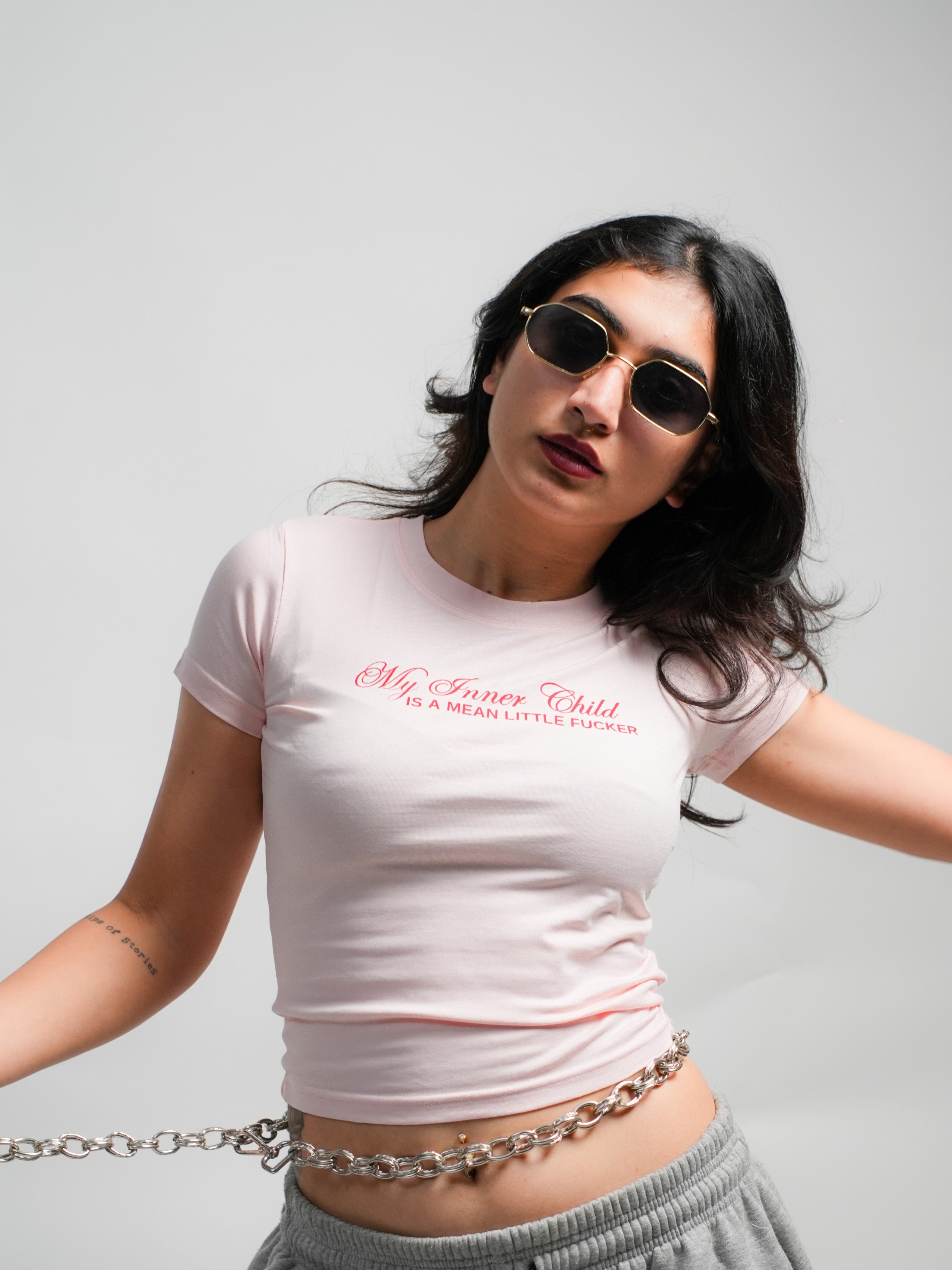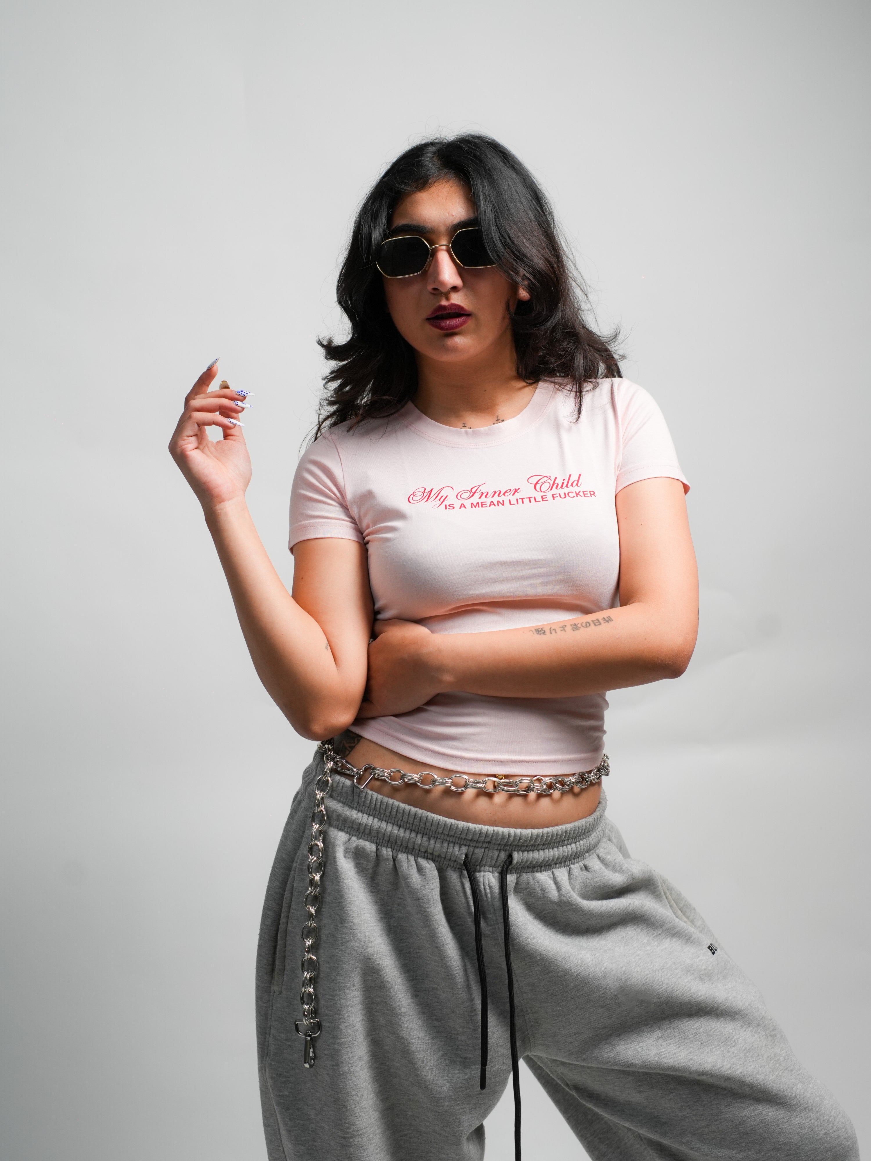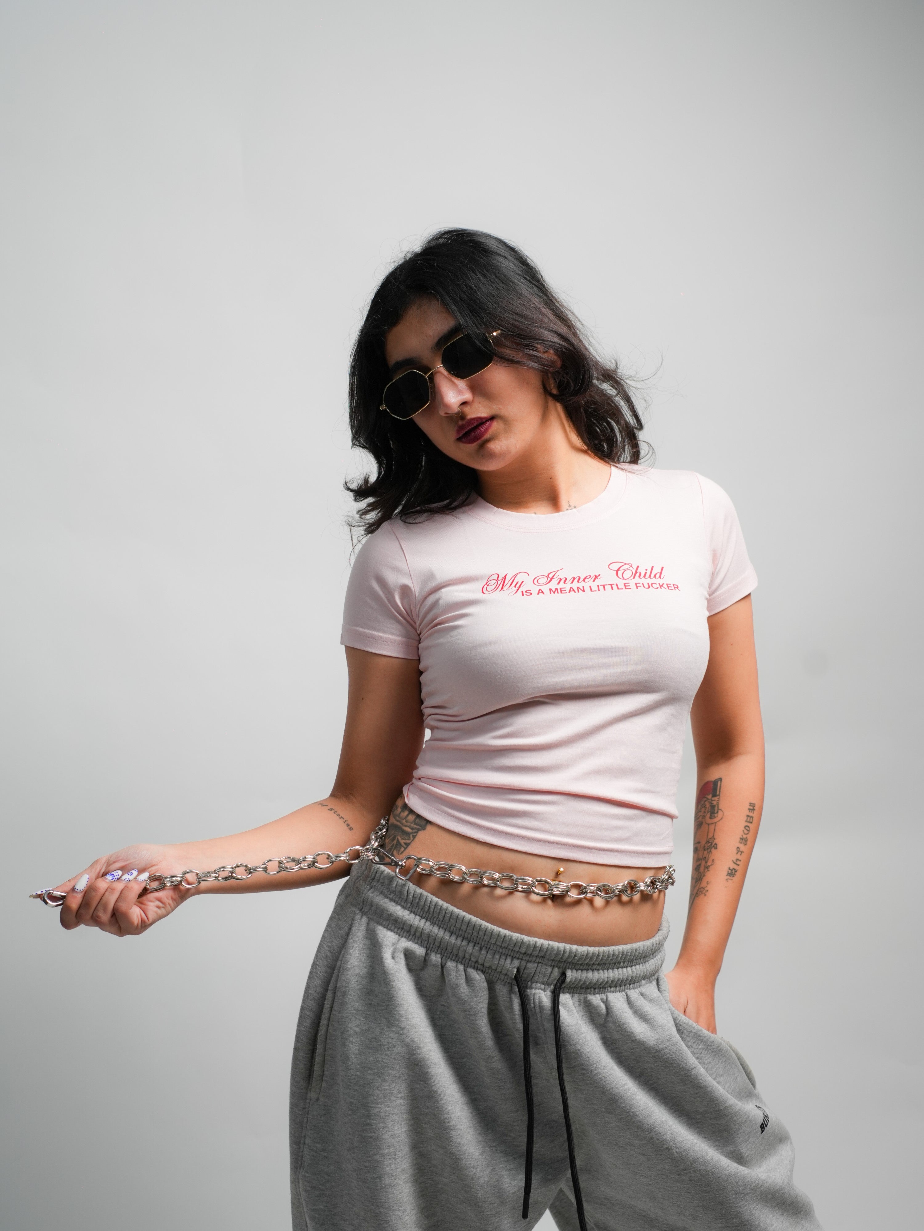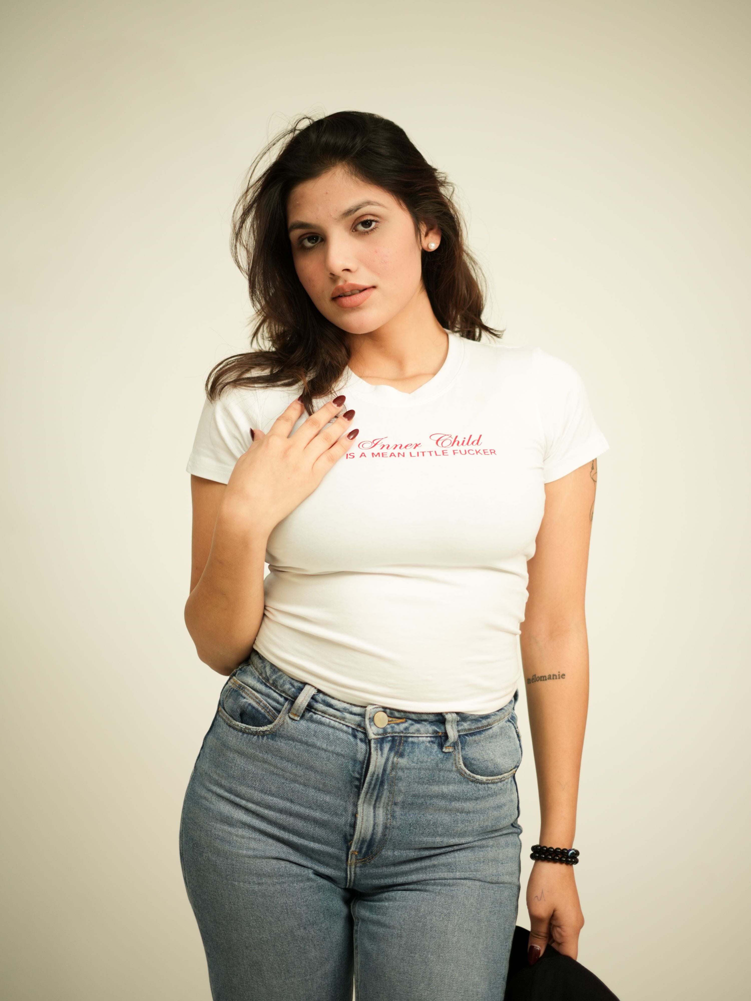 Soft fabric, savage message. The "My Inner Child" Baby Tee is for the girls who’ve done the healing, set the boundaries, and still kept their edge. Featuring the cheeky phrase “My inner child is a mean little fcker”* in elegant red script, this tee serves therapy-core realness wrapped in It Girl attitude.