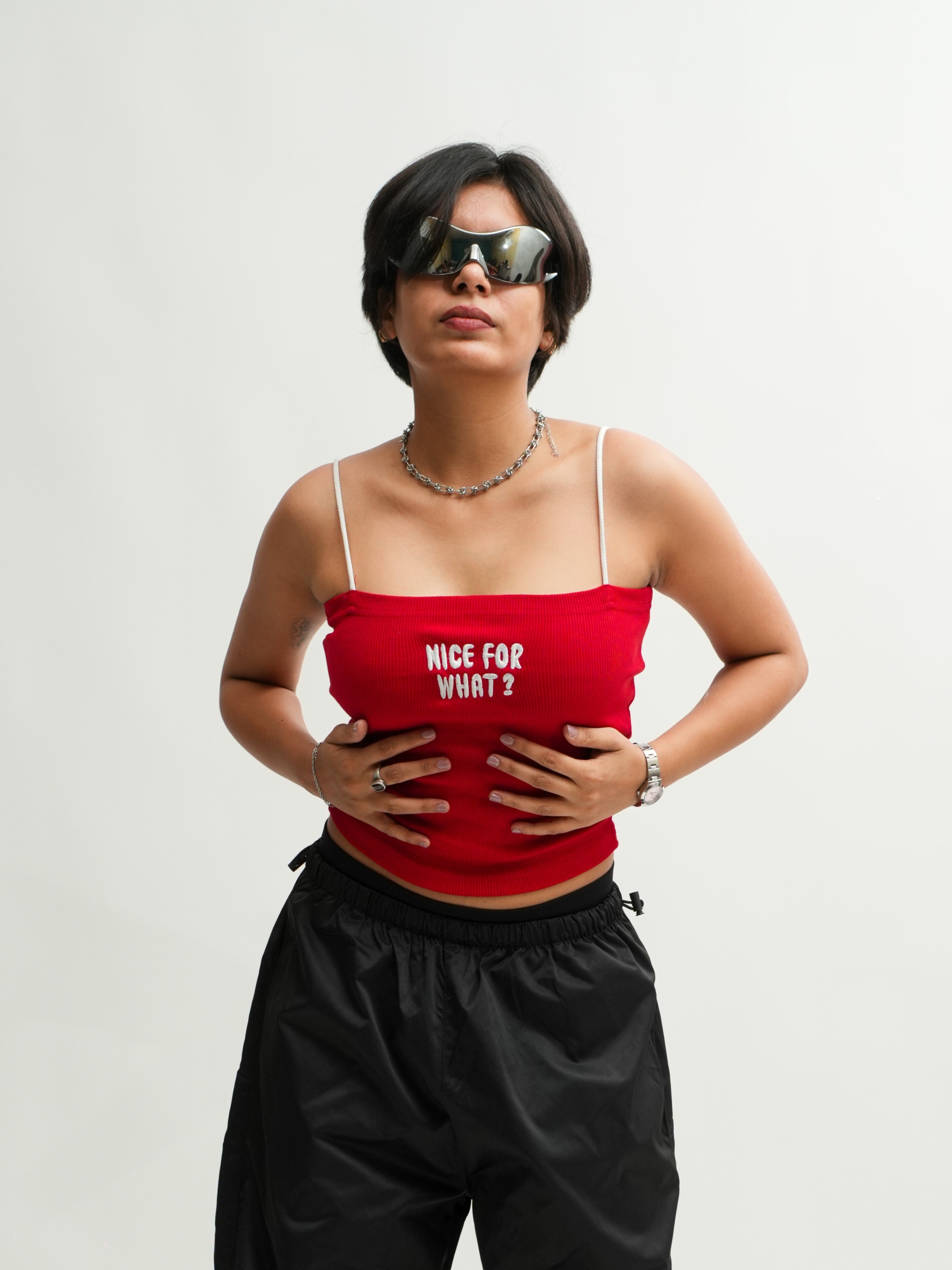 Discover our stunning Regular Fit Camisole, adorned with exquisite embroidery that spells "Nice For What ?". This alluring piece combines comfort and style effortlessly. Crafted with the finest materials, it features a flattering silhouette that accentuates your curves. Embrace elegance and let this charming camisole be a captivating addition to your wardrobe.