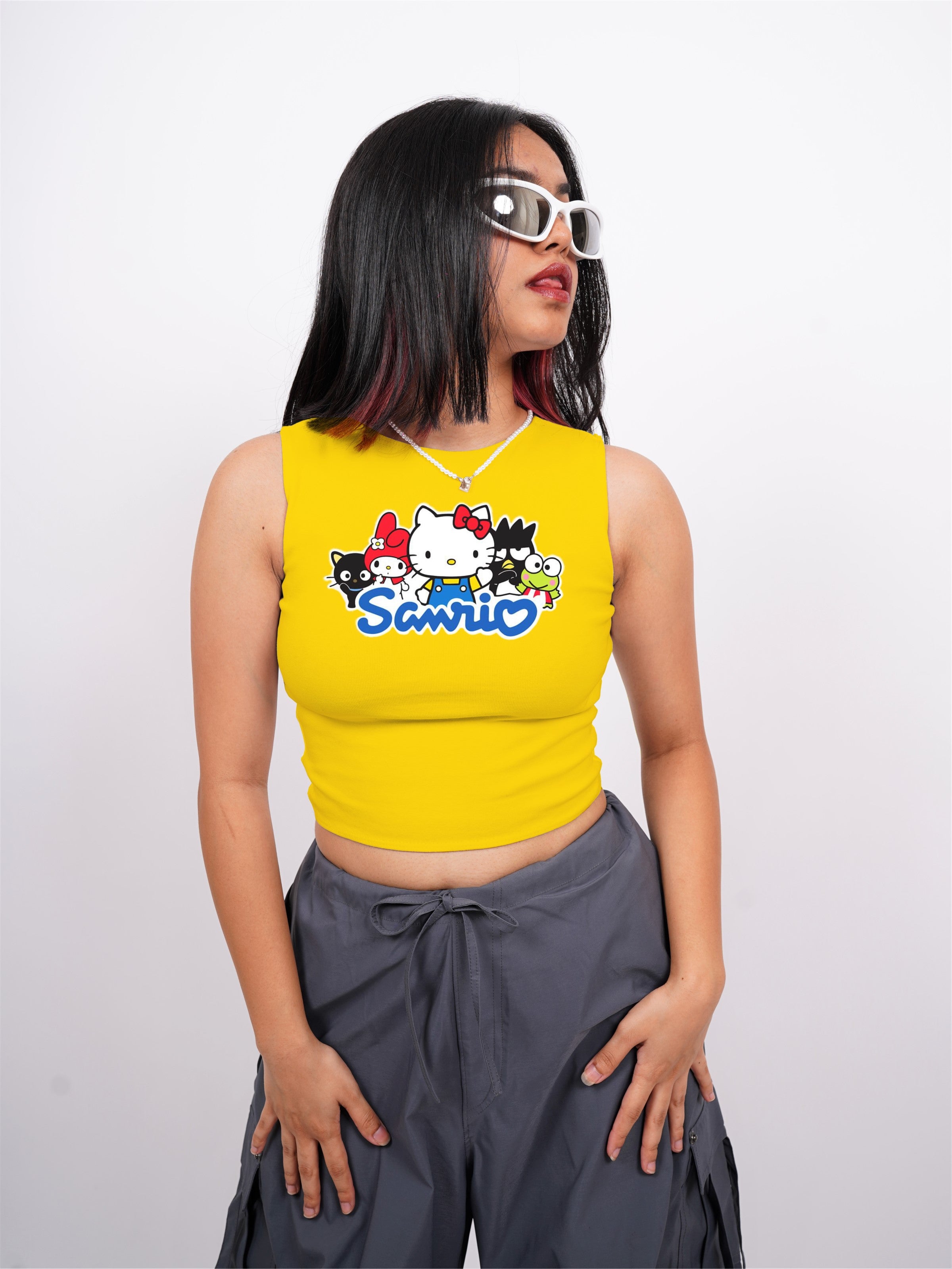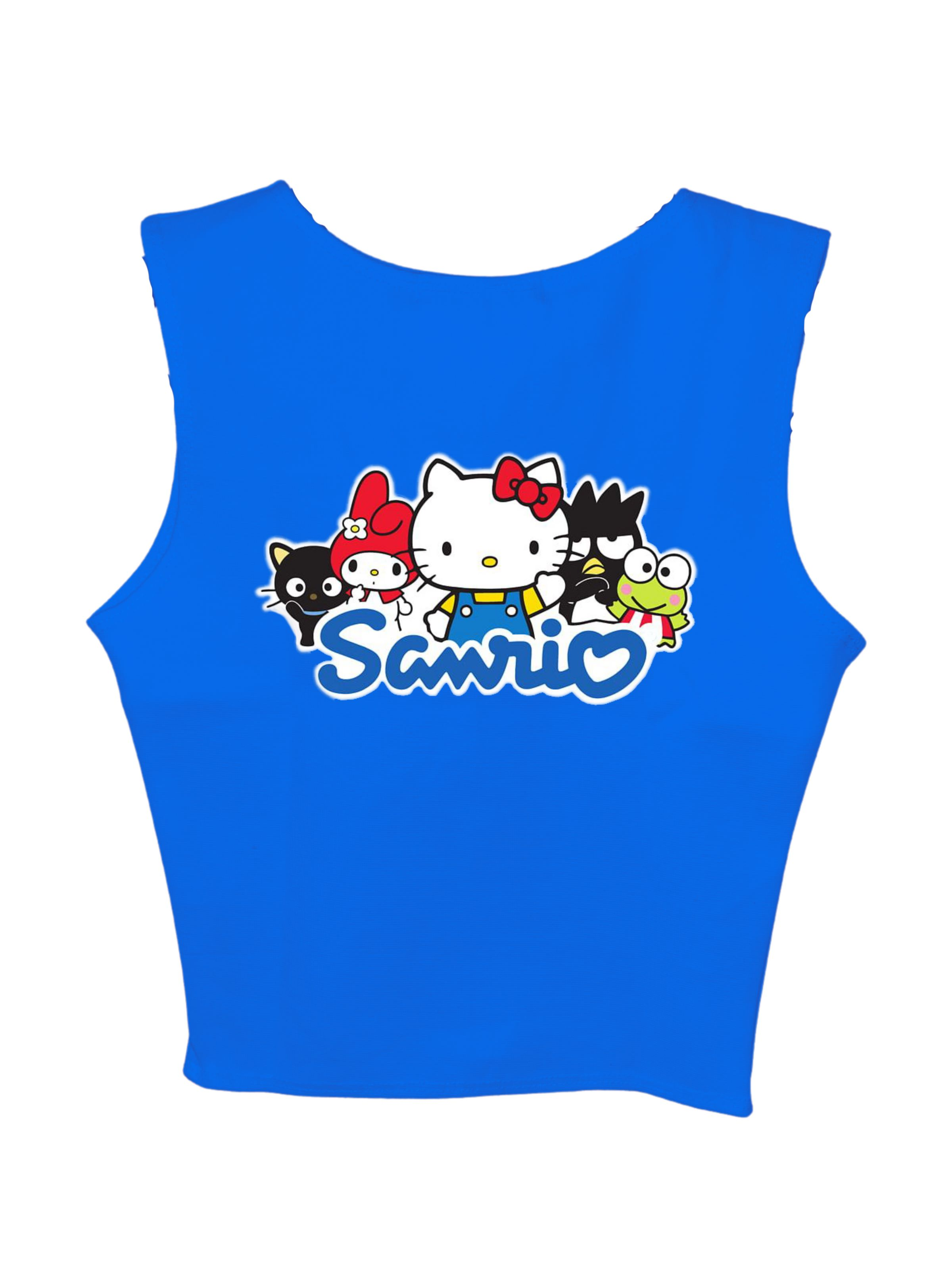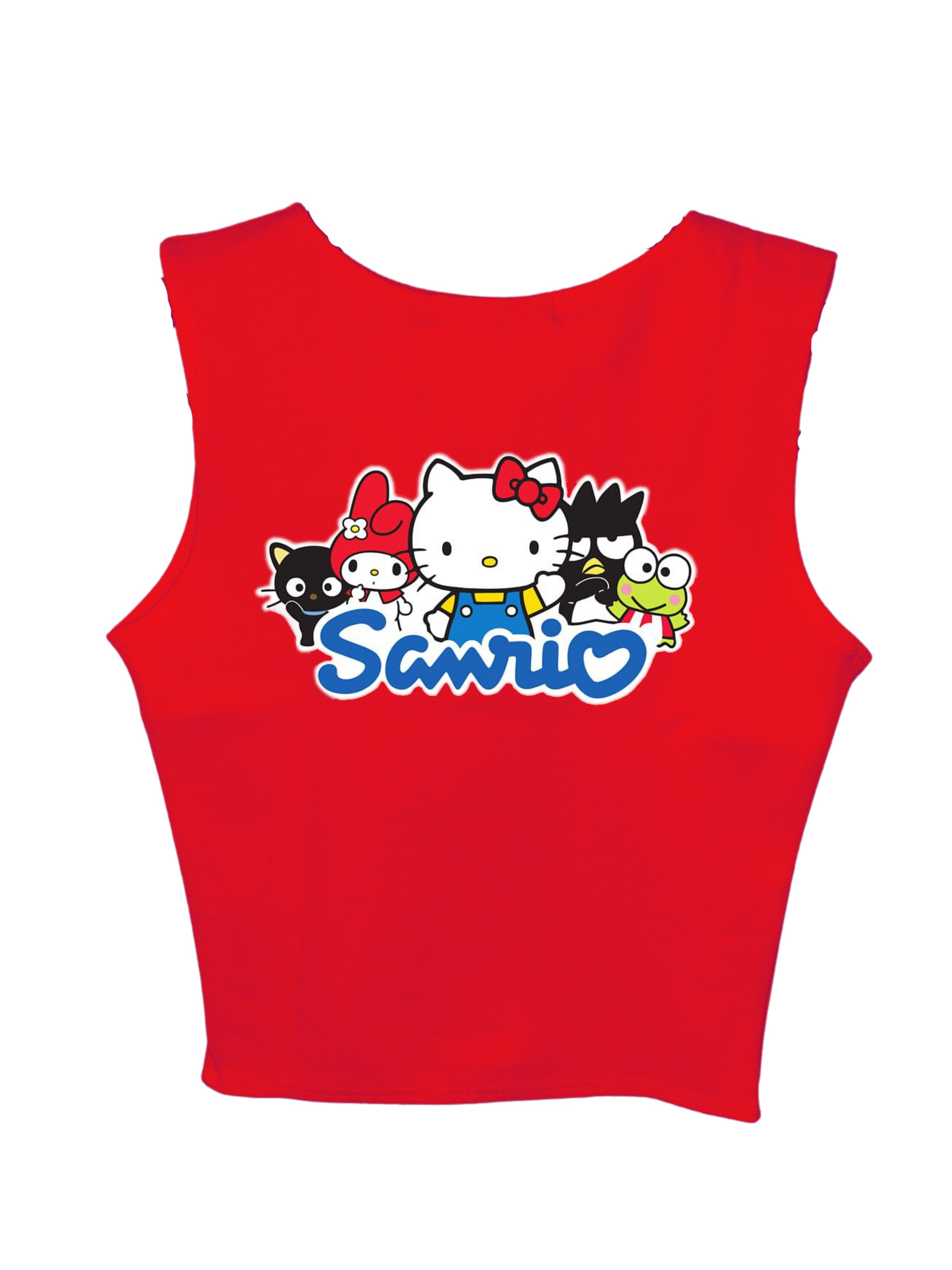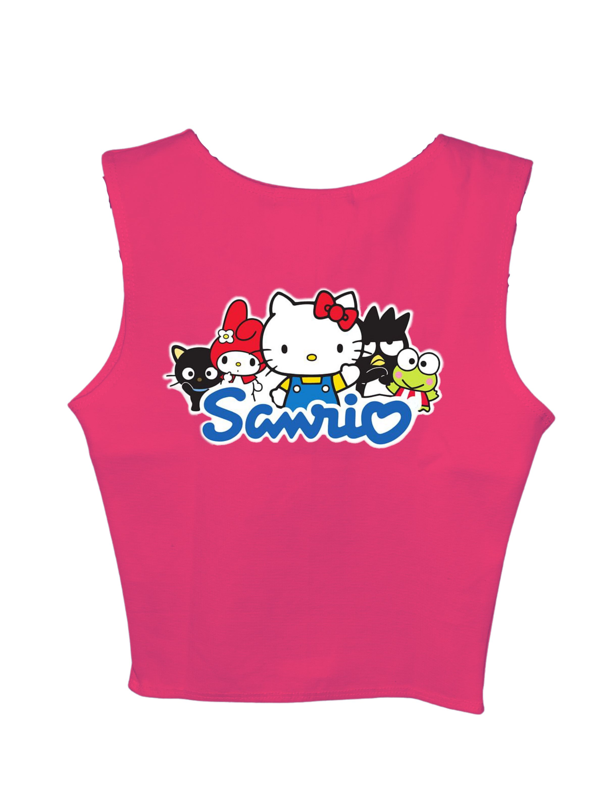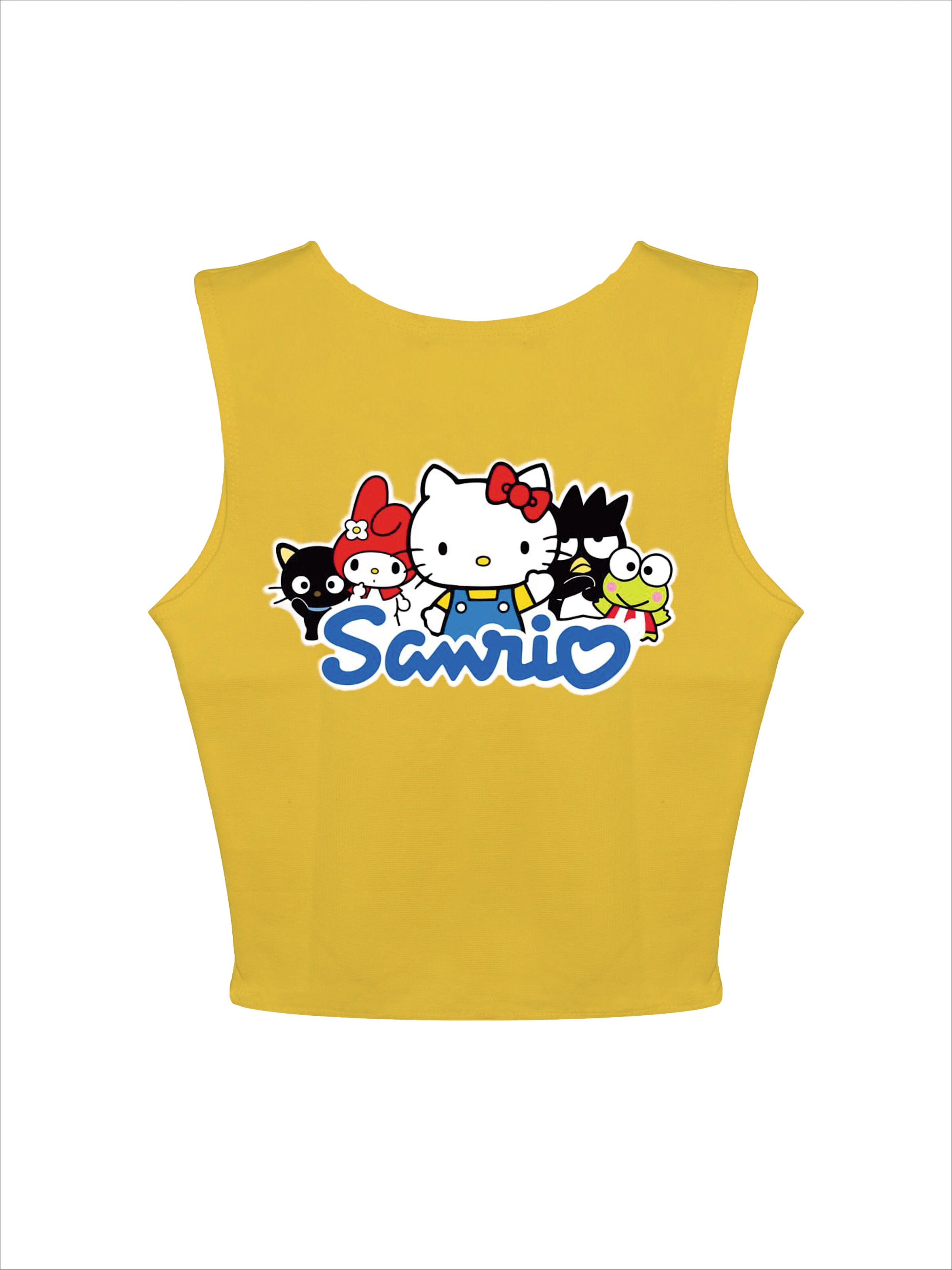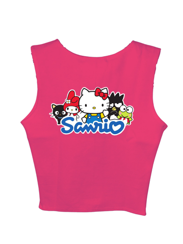 The Sanrio Family: Burger Bae Sleeveless Rachel Tank for Women bursts with playful charm and vibrant style. Featuring a delightful lineup of beloved Sanrio characters across the front, these tanks instantly brightens up any outfit. Crafted from a soft, ribbed fabric, it offers a snug yet comfortable fit that accentuates your silhouette.