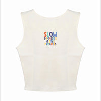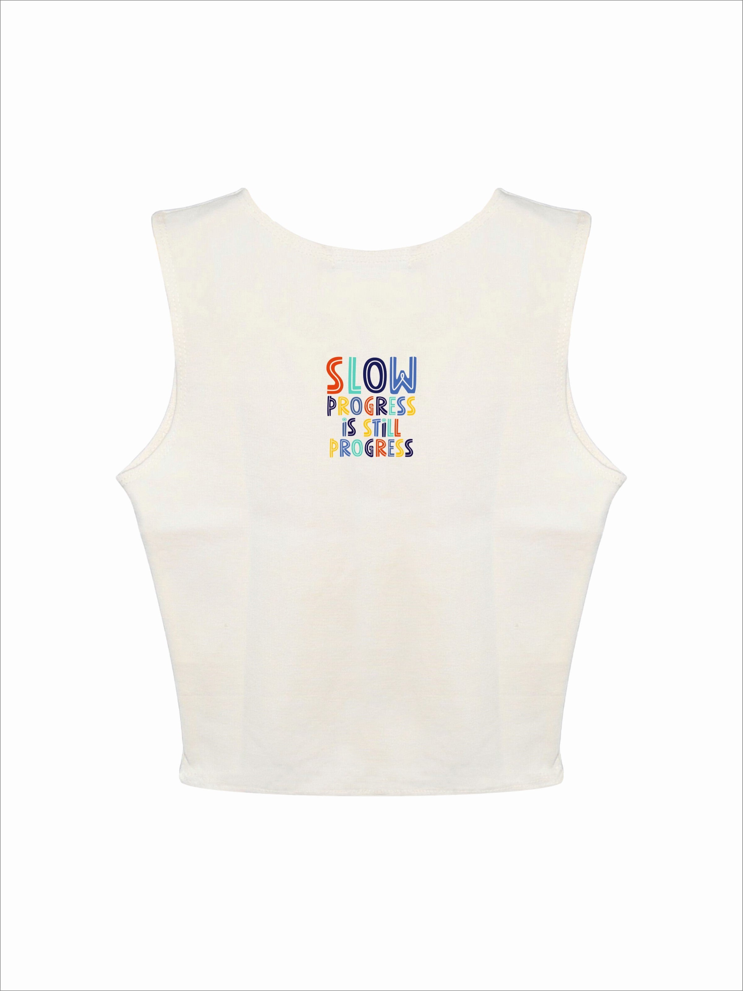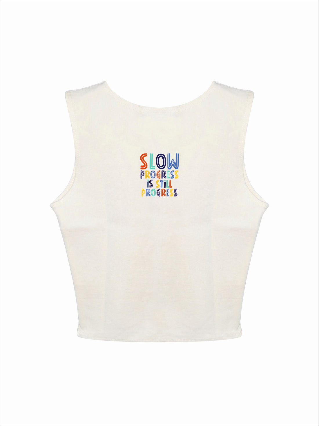 Stay motivated in style with the Slow Progress Is Still Progress Rachel Tank. This sleeveless, cropped tank features a vibrant multicolor text graphic, making a bold and inspiring statement. Made from premium, stretchable fabric, it offers a snug and flattering fit, perfect for both casual and active wear.