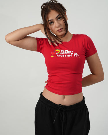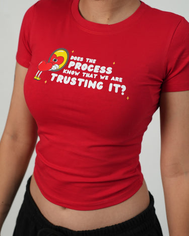 The “Does the Process Know That We’re Trusting It?” Baby Tee is the unhinged affirmation we all needed. Rocking a bold red hue with a quirky cartoon heart and existentially hilarious typography, this tee is for every girl trying to keep it together while the universe takes its sweet time.